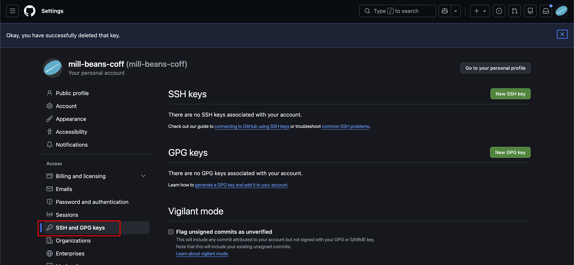 ▲SSH and GPG keys を選択します。