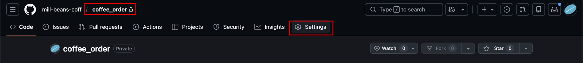 ▲リポジトリの Settings を選択します。