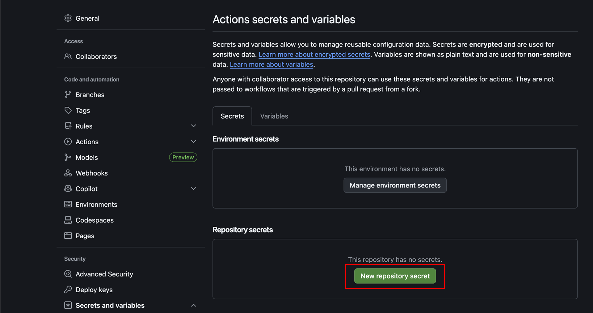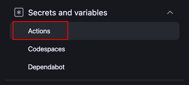 ▲左メニューのSecrets and variables > Actions を選択します。