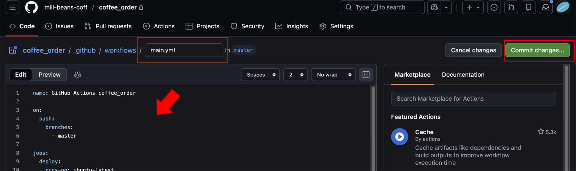 ソースの調整が完了したら、右上の「Commit changes…」をクリックして保存します。