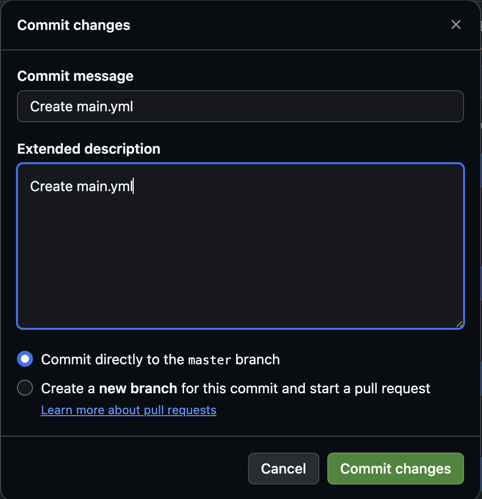▲任意のファイル名(例:main.yml)を入力し、ワークフローのソースコードを記述します。