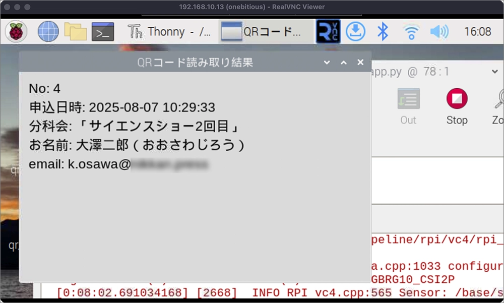 52~65行目、カメラで撮影した画像をPicamera2で取得し、pyzbarでQRコードを解析します。前回と異なるIDが読み取られた場合のみ、update_flag() 関数を実行してサーバーへ送信し、データベースのflgを更新。その結果をUIに反映する処理を行います。